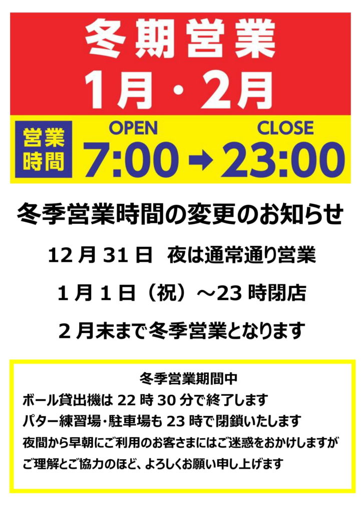 冬季営業期間(1月2月)は営業時間が変更となります。夜間から早朝にご利用のお客さまにはご迷惑をおかけしますが、ご理解のほど、よろしくお願いいたします。