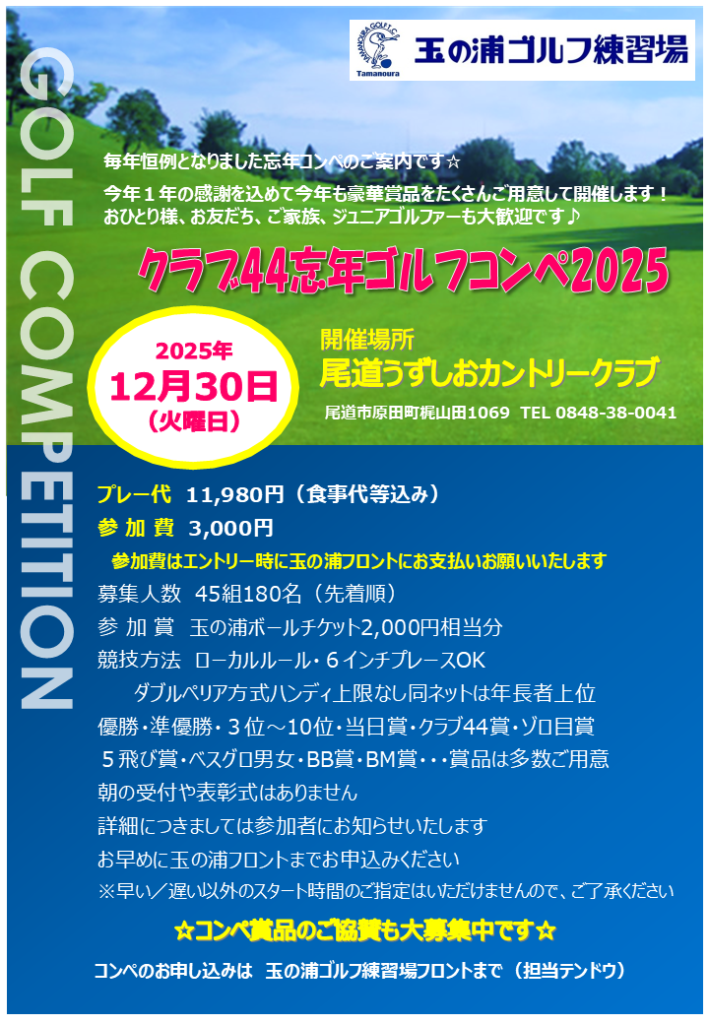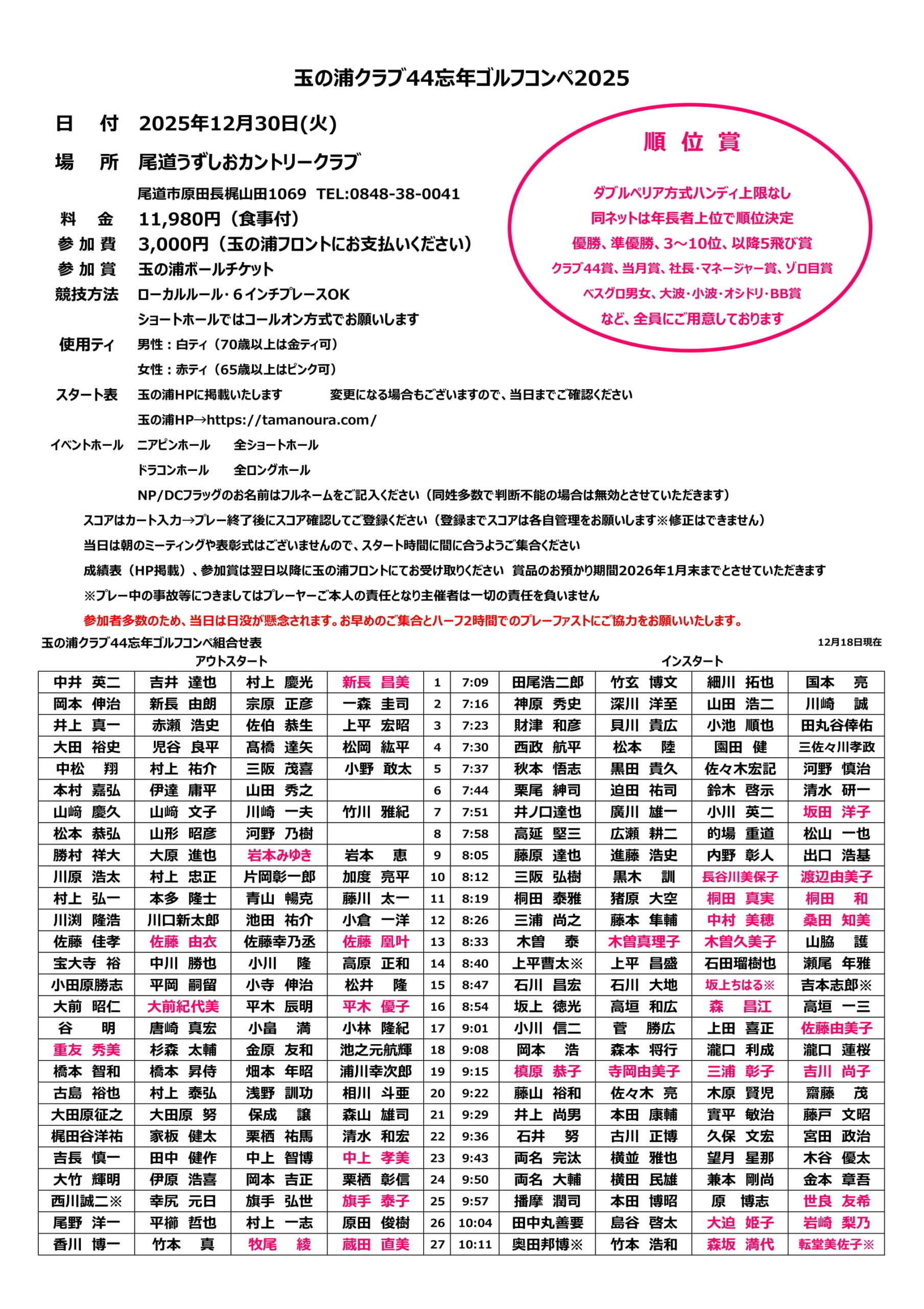 玉の浦クラブ44忘年ゴルフコンペはお申込み多数により満席となりました。ただ今、キャンセル待ちのみ受付させていただいております。たくさんのお申込みをいただきまして、ありがとうございます。スタート表をご確認ください。成績表もこちらHPにアップさせていただきます。